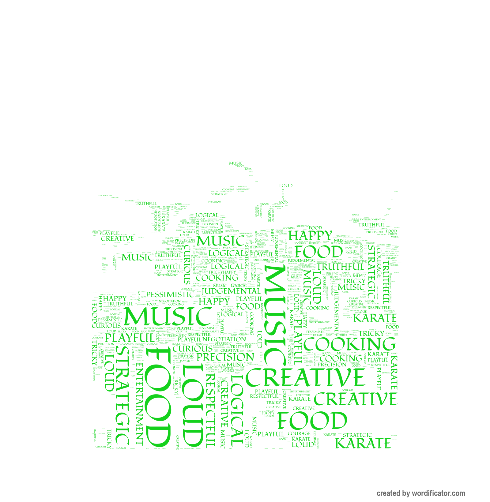 Judgemental Respectful Truthful Happy Loud Food Cooking Music Entertainment Playful Precision Karate Courage Tricky Creative Negotiation Strategic Pessimistic Curious Logical Patient Independent Chaotic Resilience Responsible Honor Empathy Justice