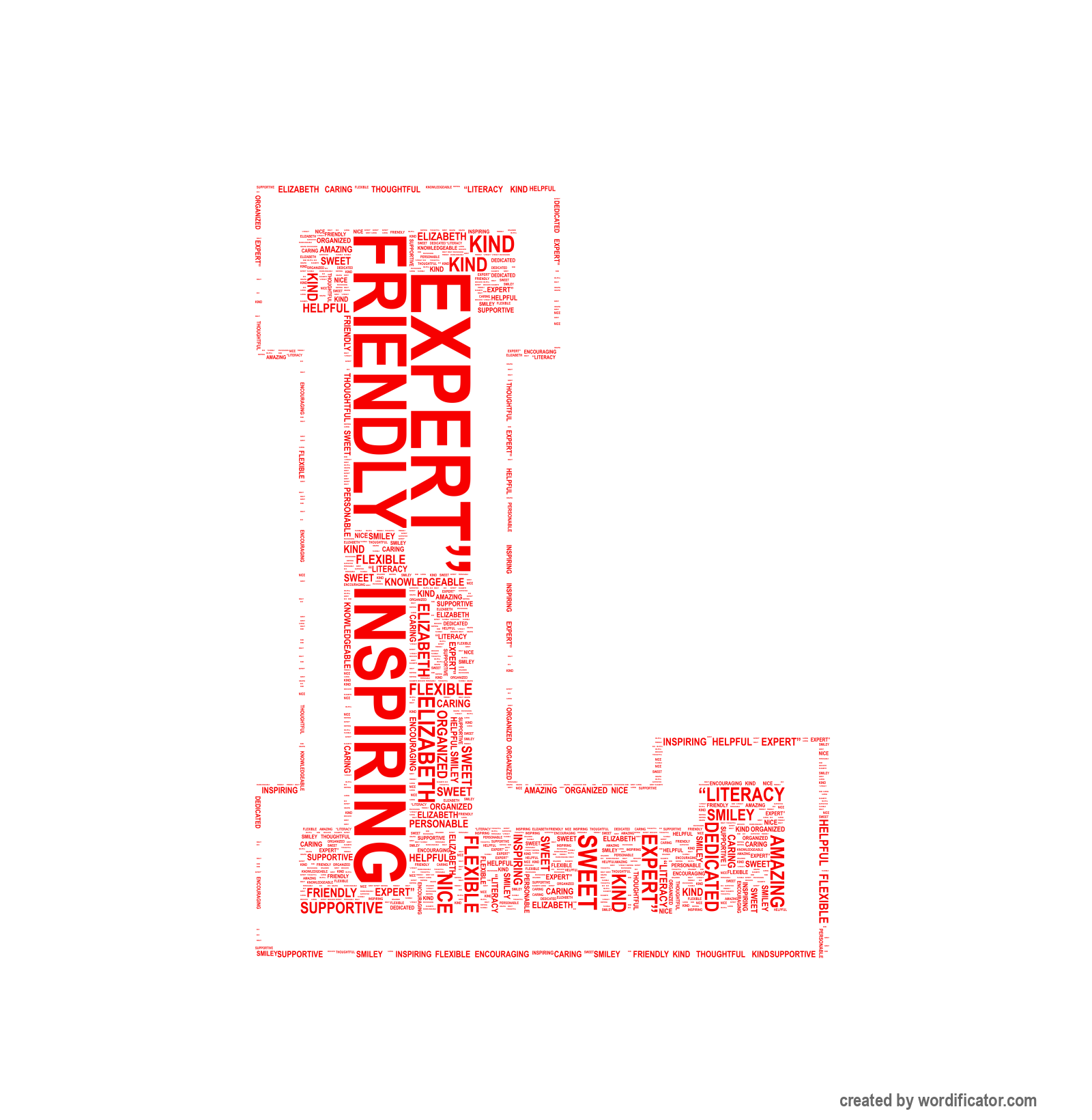Elizabeth Friendly Knowledgeable Amazing Dedicated Flexible Encouraging Kind Smiley Sweet Organized Supportive Inspiring Caring Nice Thoughtful Helpful “Literacy Expert” Personable Leader Visionary Charming Funny “The most helpful and thoughtful cousin ever!”