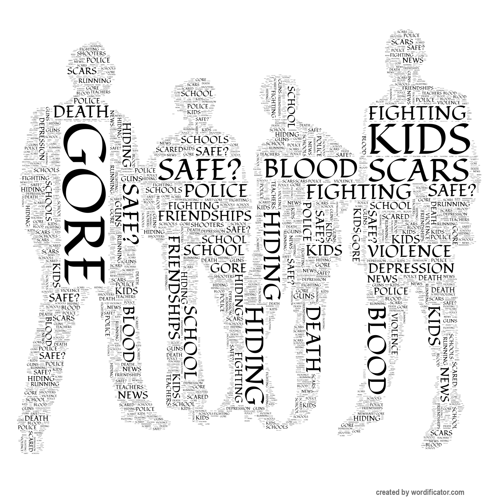 Guns Violence Schools Kids Teachers Death Blood Gore News Scared Running Hiding Fighting Friendships Depression Safe? Police Scars School Shooters Haven Defense Lies Drugs 30-Seconds Choice Determination Freedom Betrayal Anonymous Tips Tricks