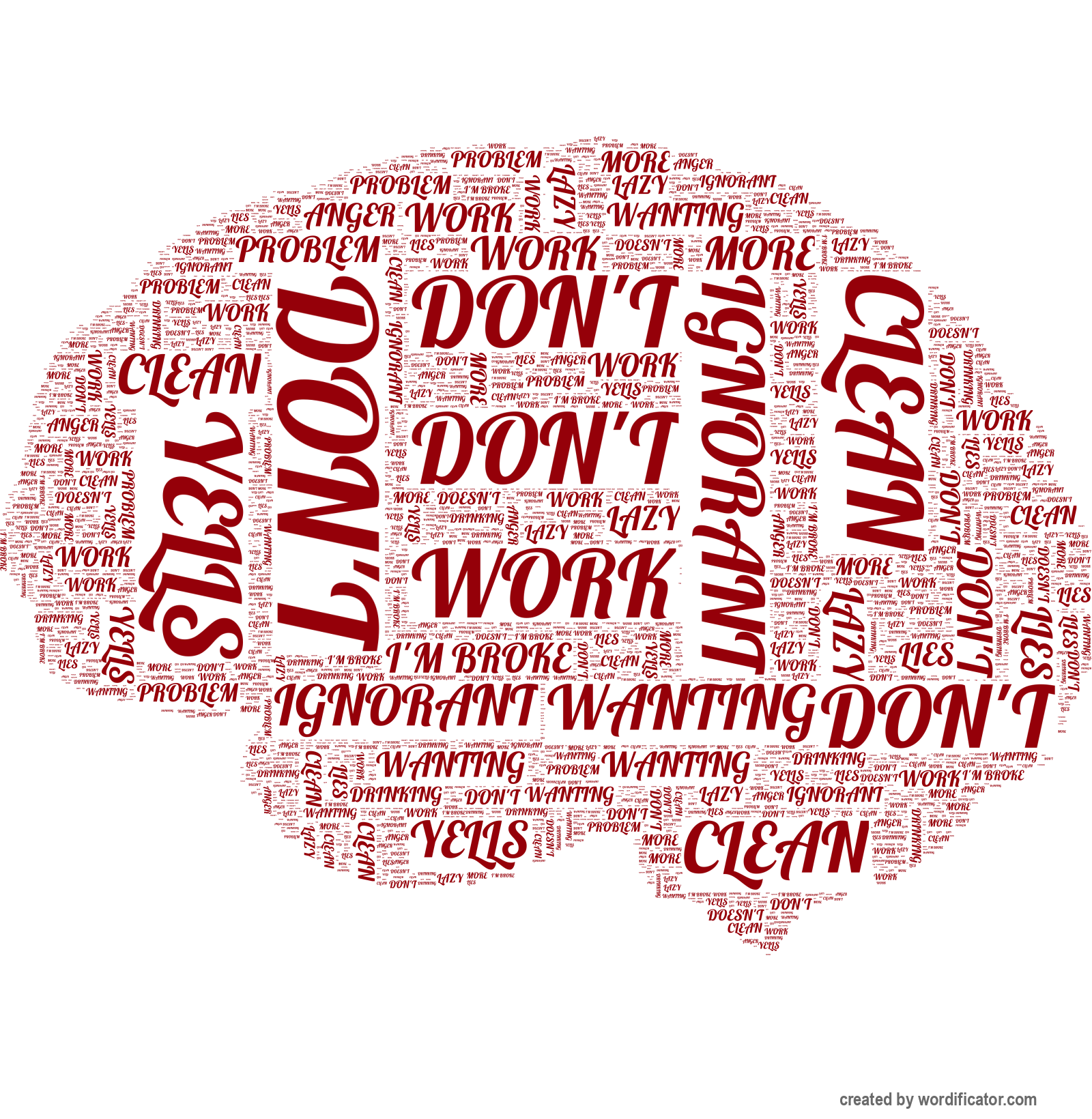 I'm broke wanting more don't clean doesn't yells ignorant work lies lazy drinking problem anger