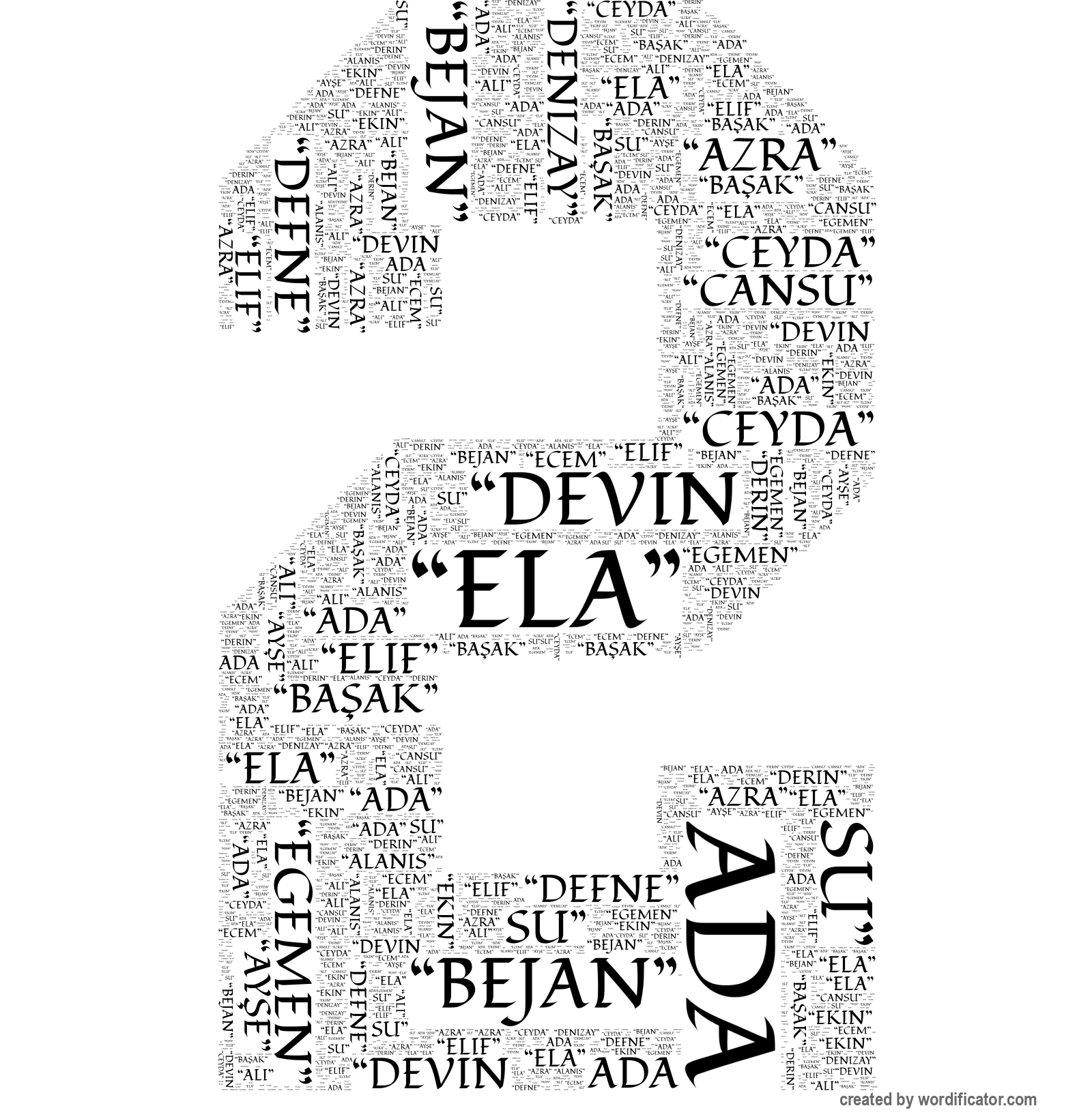 Ada “Ada” “Alanis” “Ali” “Ay?e” “Azra” “Ba?ak” “Bejan” “Cansu” “Ceyda” “Defne” “Denizay” “Derin” “Devin Su” “Ecem” “Egemen” “Ekin” “Ela” “Elif” “Enda” “Emanur” “Esmannur” “Hamide” “Hiranur” “Il?g?n” “?rem” “?layda” “Melis” “Melisa” “Meriç” “Mona” “Neva” “Nur” “Parmin” “Sudenur” “?evval” “?evval “Tuana” “Zahra” “Zerda”