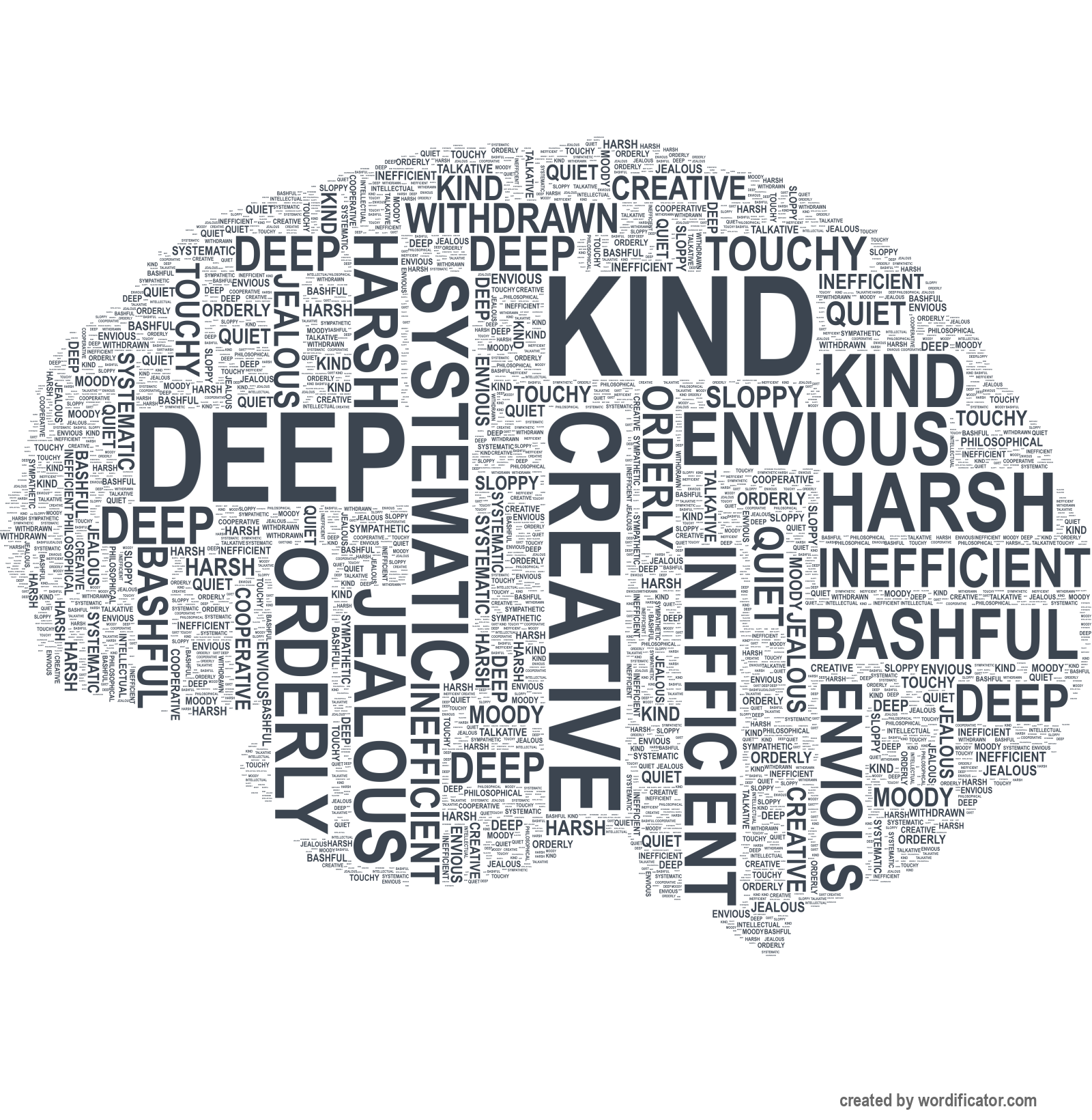 Talkative Sympathetic Orderly Envious Deep Withdrawn Harsh Systematic Moody Philosophical Bashful Kind Inefficient Touchy Creative Quiet Cooperative Sloppy Jealous Intellectual Extroverted Cold Disorganized Temperamental Complex Shy Warm Efficient Fretful Imaginative Enthusiastic Self Careless Calm Traditional Lively