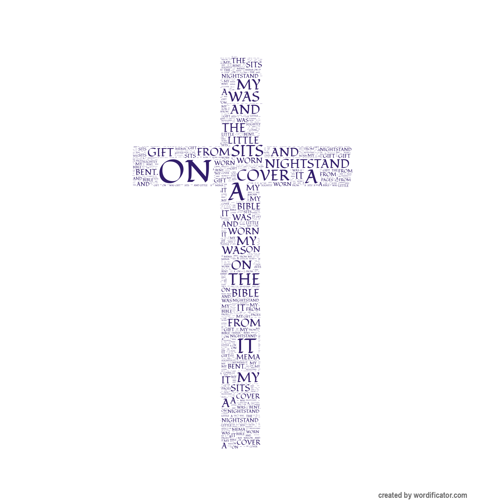 My Bible sits on my nightstand the cover a little worn and pages slightly bent. It was gift from Mema when I turned sixteen. She wanted me to have it because that time came forward about being sexually abused younger. told keep close for would always guide me. Sometimes am stressed or worried something open read through one of books. makes think how people in hard times Christ strength. Just like Noah did earth flooded. That book/verse (Genesis 6:9-9:17) reminds whenever things feel out control just need eye towards god he will provide. My bible isn’t book is reminder truly never alone help it. And must been mind reader she gave needed most.