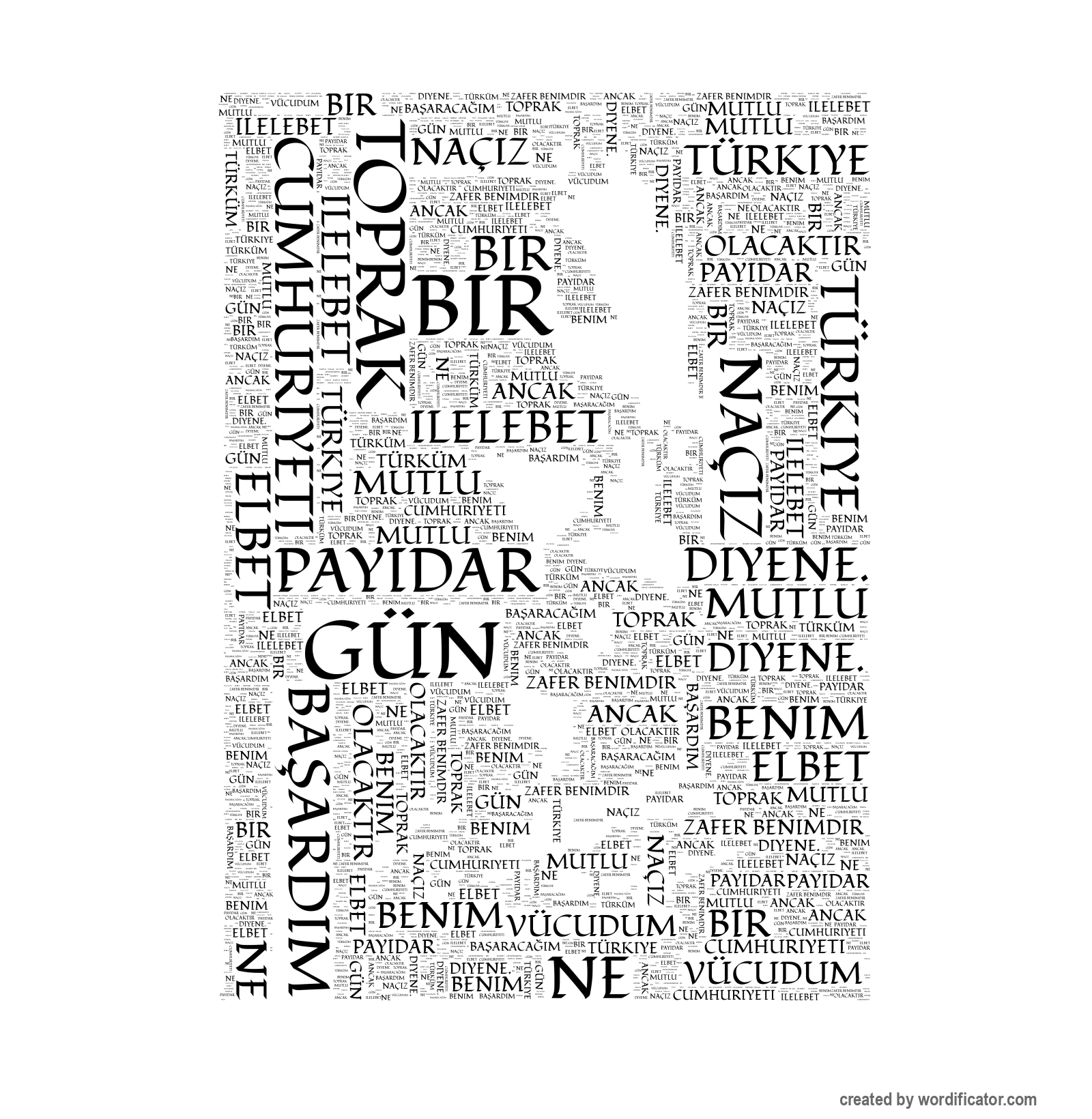 Türküm Zafer benimdir Ba?araca??m Ba?ard?m Ne mutlu diyene. Benim naçiz vücudum elbet bir gün toprak olacakt?r ancak Türkiye Cumhuriyeti ilelebet payidar kalacakt?r. Yurtta sulh cihanda sulh. Sizlere sald?rman?z? de?il ölmenizi emrediyorum. Memleketin efendisi hakiki müstahsil olan köylüdür. Do?ruyu söylemekten korkmay?n?z. Beni görmek demek mutlaka yüzümü de?ildir. fikirlerimi benim duygular?m? anl?yorsan?z ve hissediyorsan?z bu yeterlidir. Cumhuriyetinin temeli kültürdür. Süngülerle silahlarla kanla kazand???m?z askeri zaferlerden sonra kültür bilim fen ekonomi alanlar?nda da zaferler kazanmaya devam edece?iz. Zafer diyebilenindir. Ba?ar? ise diye ba?layarak sonunda Egemenlik verilmez al?n?r. Egemenlik kay?ts?z ?arts?z ulusundur. Milleti kurtaranlar yaln?z ö?retmenlerdir. Ö?retmenler: Yeni nesiller sizlerin eseri olacakt?r. Hayatta en mür?it ilimdir. Türk ba??ms?z ya?am?? ba??ms?zl??? varolmalar?n?n yegâne ko?ulu olarak kabul etmi? cesur insanlar?n torunlar?d?r. Bu millet hiçbir zaman hür olmadan ya?amam??t?r ya?ayamaz ya?amayacakt?r. Biz Türkler tarih boyunca hürriyet istiklale timsal olmu? milletiz. San'ats?z kalan ulusun hayat damarlar?ndan biri kopmu? demektir. vatan? bütündür parçalanamaz. milletinin tabiat âdetlerine uygun idare Cumhuriyet idaresidir. milleti ayr?lmaz bütündür. Millet sevgisi kadar büyük mükâfat yoktur. memleket tarihte Türk'tü halde Türk'tür ebediyen ya?ayacakt?r. istiklâlsiz Türk ö?ün çal?? güven. Bütün cihan bilsin ki için tarafl?k vard?r tarafl???. Yurt ona hizmetle ölçülür. Çanakkale geçilmez !