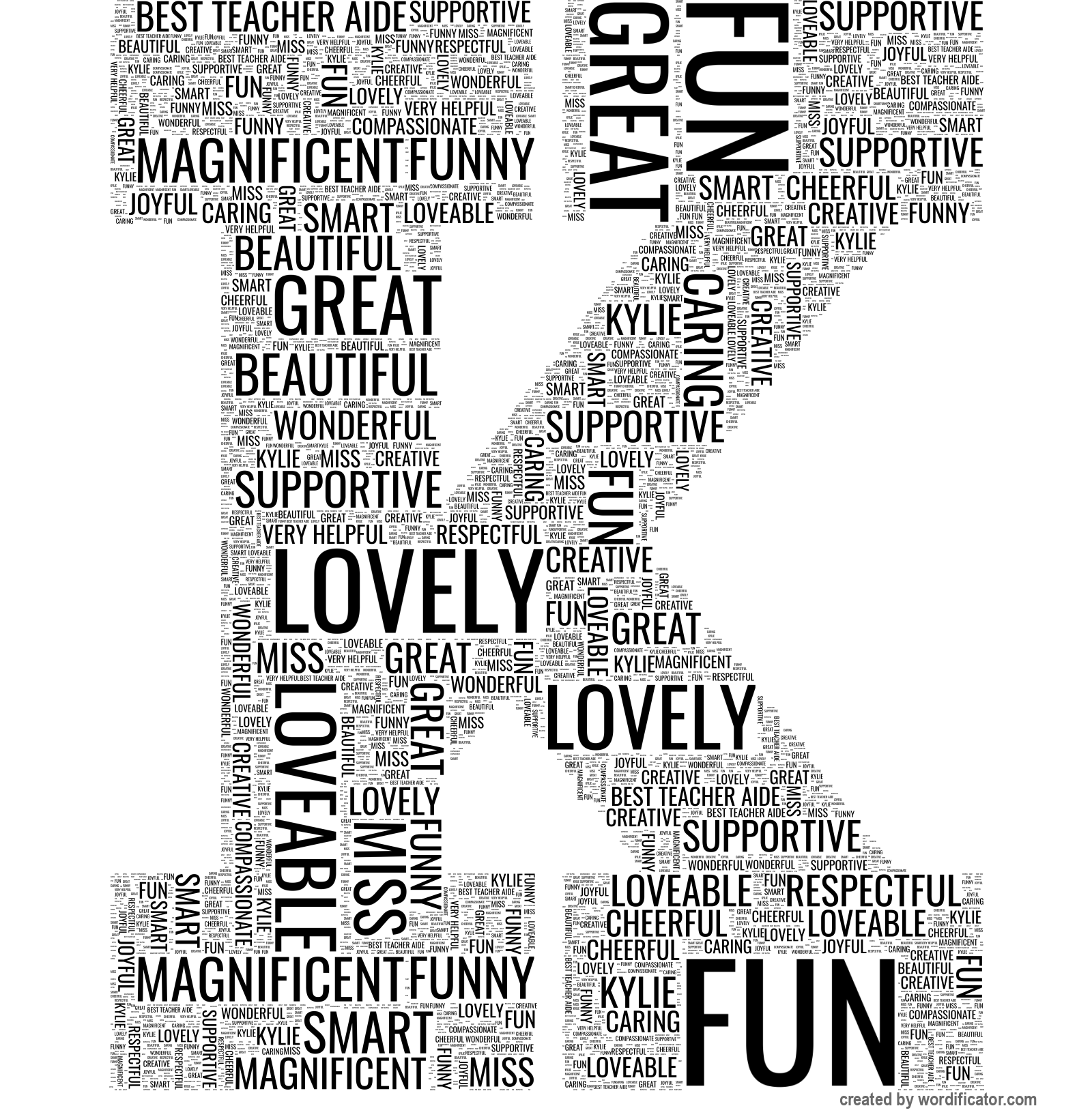 very helpful best teacher aide Miss Kylie magnificent compassionate fun wonderful lovely funny supportive caring great joyful beautiful creative smart cheerful respectful loveable