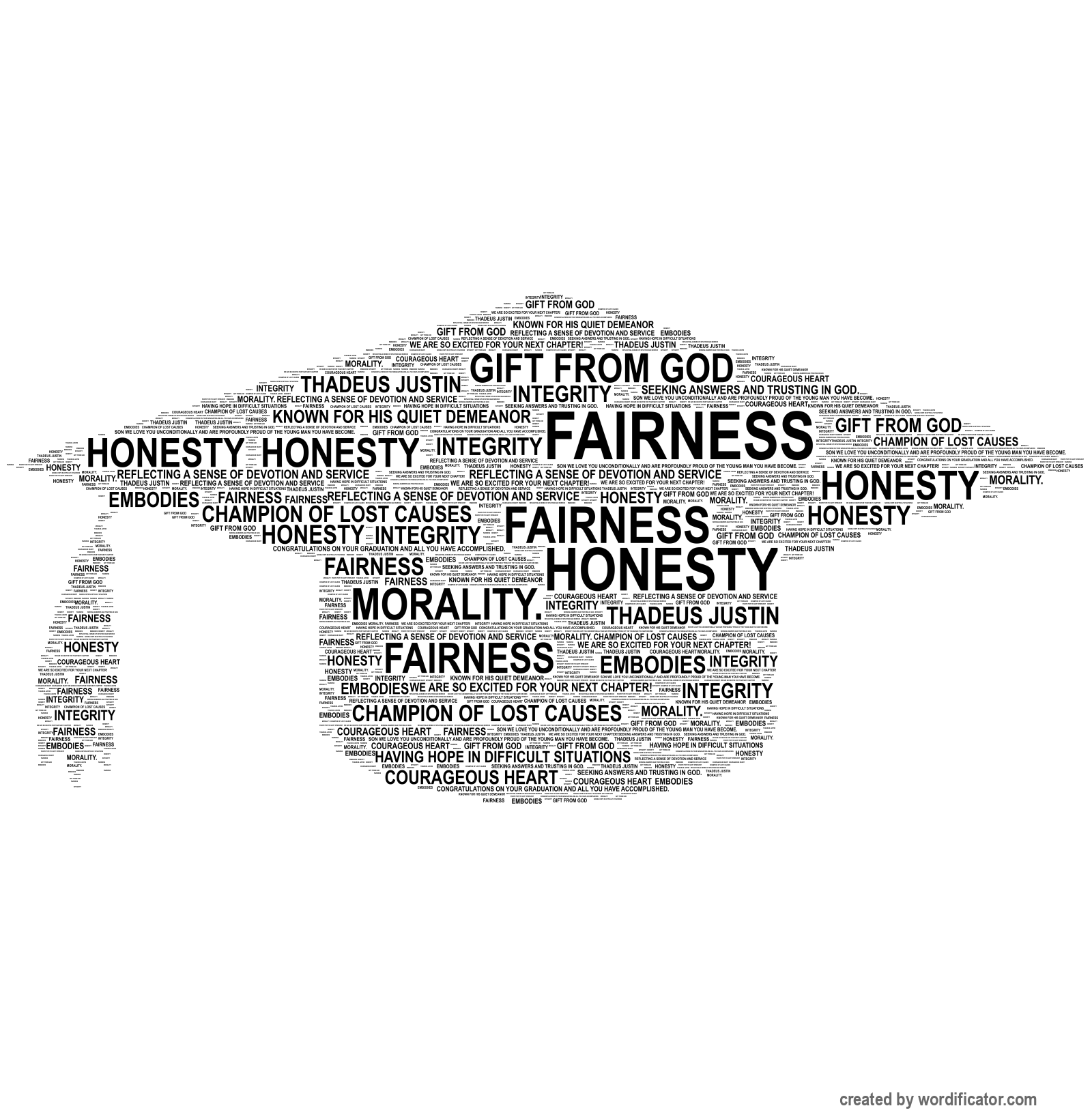 Thadeus Justin Gift from God Courageous heart reflecting a sense of devotion and service Known for his quiet demeanor champion of lost causes having hope in difficult situations seeking answers and trusting in God. Son we love you unconditionally and are profoundly proud of the young man you have become. Congratulations on your graduation and all you have accomplished. We are so excited for your next chapter! Embodies fairness honesty integrity morality.